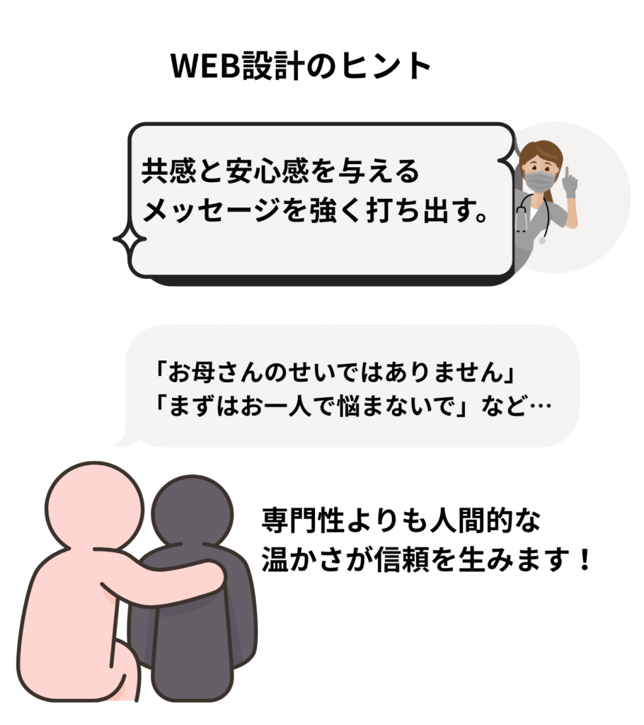 - 「お母さんのせいではありません」「まずはお一人で悩まないで」といった共感と安心感を与えるメッセージを強く打ち出しましょう。この段階では専門性よりも人間的な温かさが信頼を生みます。