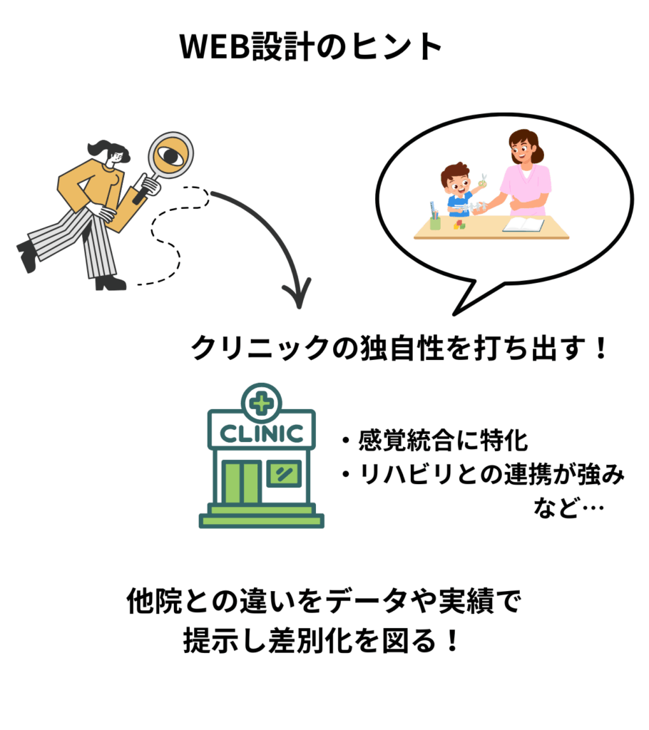 - あなたのクリニックの”独自性”を明確に打ち出しましょう。「うちは感覚統合に特化している」「言語聴覚士と作業療法士の連携が強みだ」など、他院との違いをデータや実績で提示します。