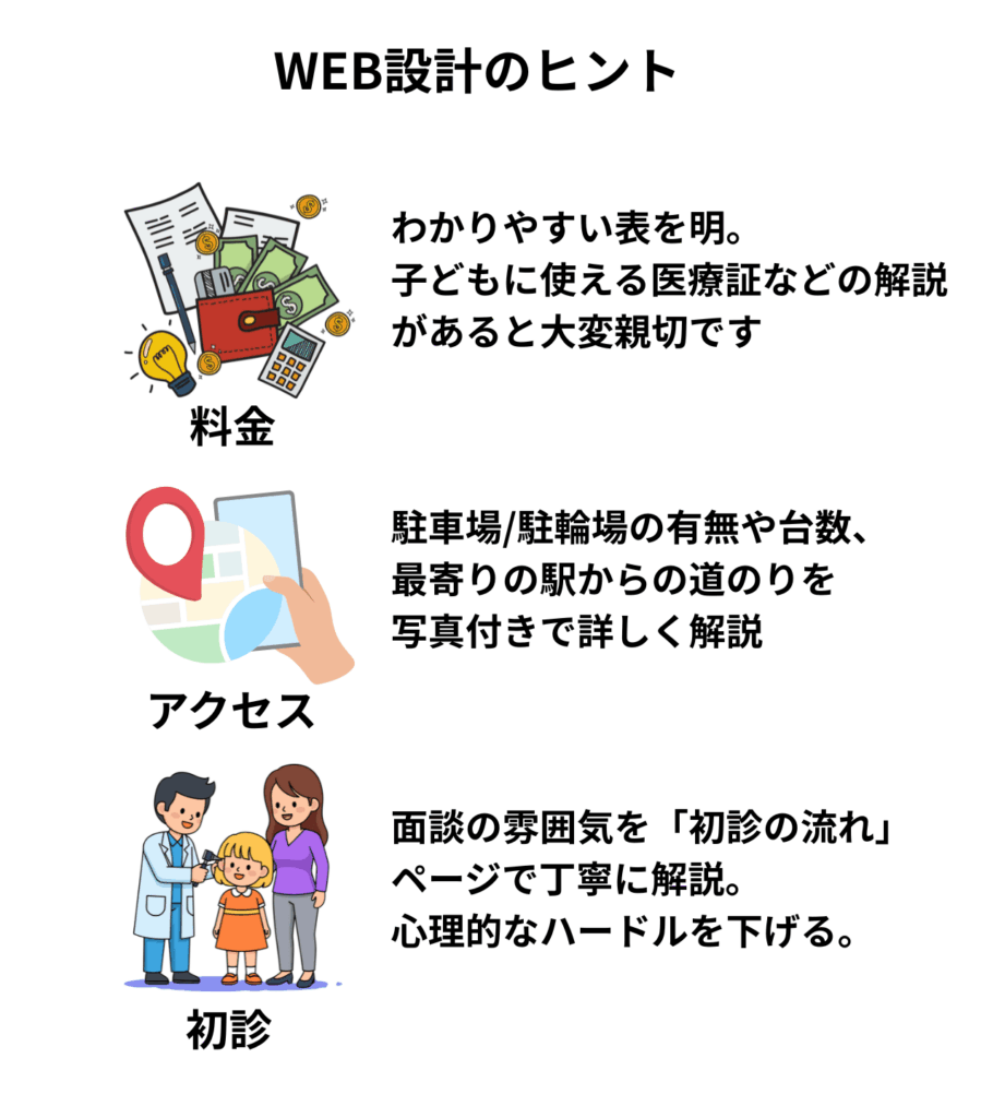 - 料金体系: わかりやすい表を明記したり、子どもに使える医療証などの解説があると大変親切です。