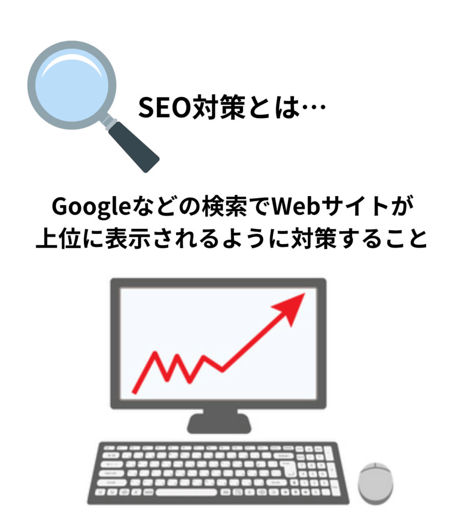 SEO(Search Engine Optimization:検索エンジン最適化)は、Googleなどの検索でWebサイトが上位に表示されるように対策することです。