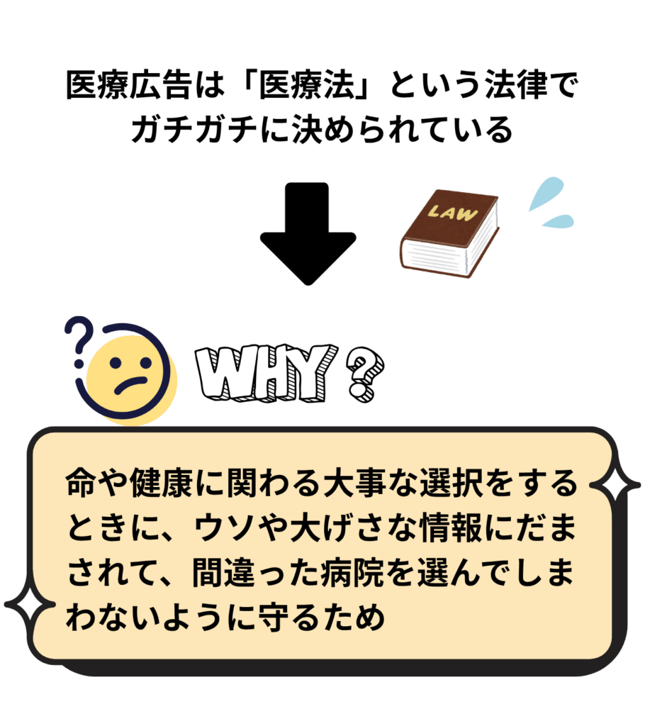 なぜこんなに厳しいのかというと、私たちが命や健康に関わる大事な選択をするときに、ウソや大げさな情報にだまされて、間違った病院を選んでしまわないように守るためなんです。