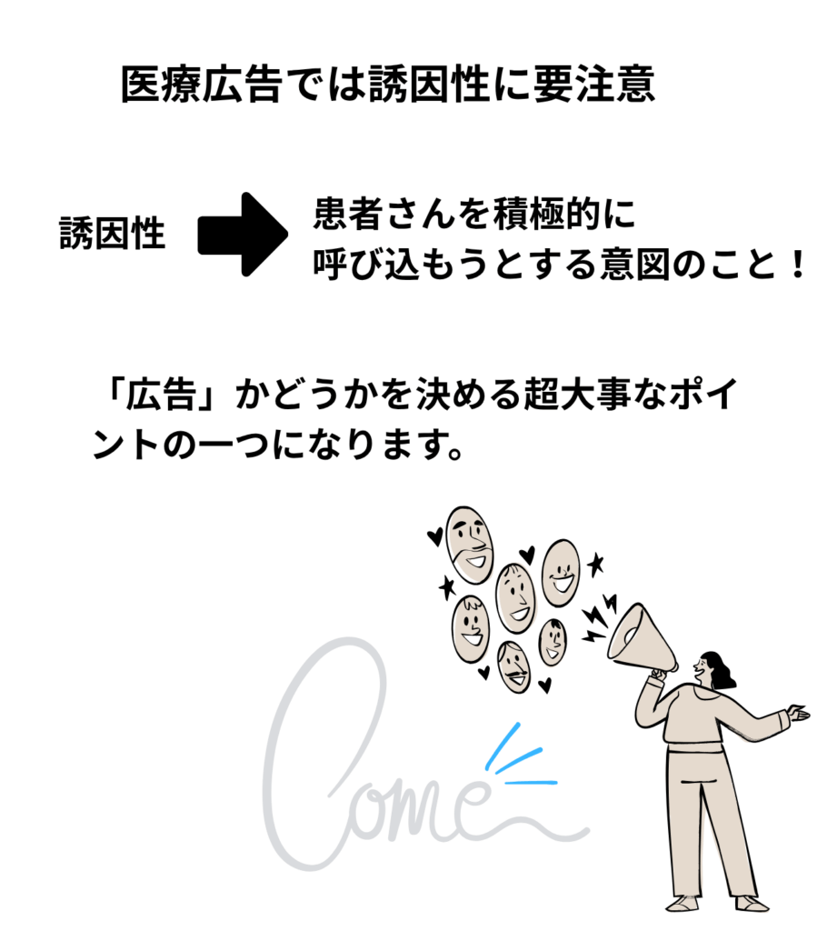 誘引性っていうのは、ズバリ!「うちの病院に来て、治療を受けてね!」って、患者さんを積極的に呼び込もうとする意図のこと!「広告」かどうかを決める超大事なポイントの一つになります。