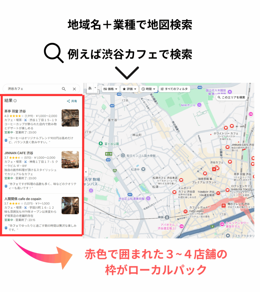 このとき、検索結果の目立つ場所に、写真付きで表示される3〜4店舗の枠(ローカルパック)に入っているかどうかが勝負。ここに入れば、お客さんは迷わずあなたの店を選びやすくなります。
