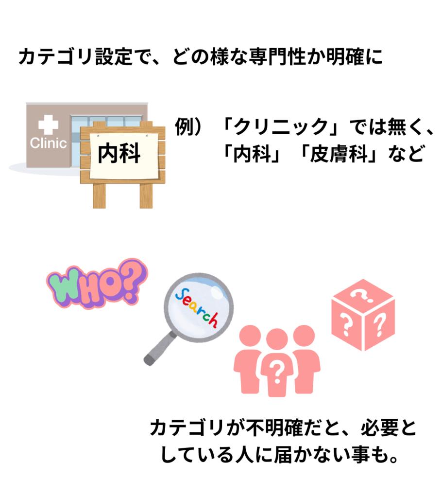 メインカテゴリ:最も重要なサービスを具体的に(例:ただの「病院」ではなく「内科」や「皮膚科」、ただの「介護」ではなく「デイサービス」)。