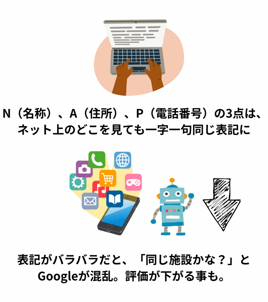 N(名称)、A(住所)、P(電話番号)の3点セットは、公式サイトや他の情報サイトを含め、ネット上のどこを見ても一字一句同じ表記に統一してください。