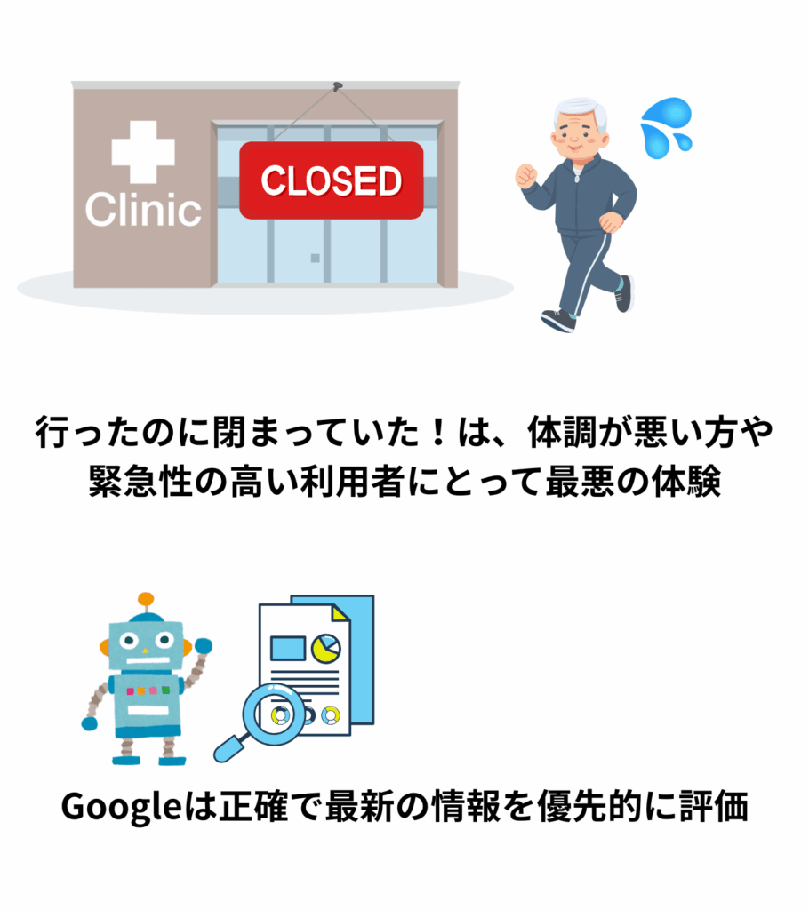 「行ったのに閉まっていた!」は、特に体調が悪い方や緊急性の高い利用者にとって最悪の体験になります。