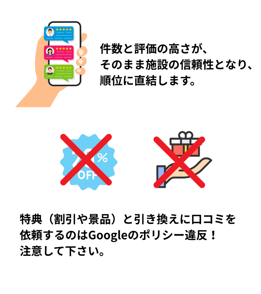- 誠実な対応が原則:ただし、特典(割引や景品)と引き換えに口コミを依頼するのはGoogleのポリシー違反です。あくまで「今後のサービス向上のため、ご協力をお願いします」と純粋にお願いする形が信頼を高めます。